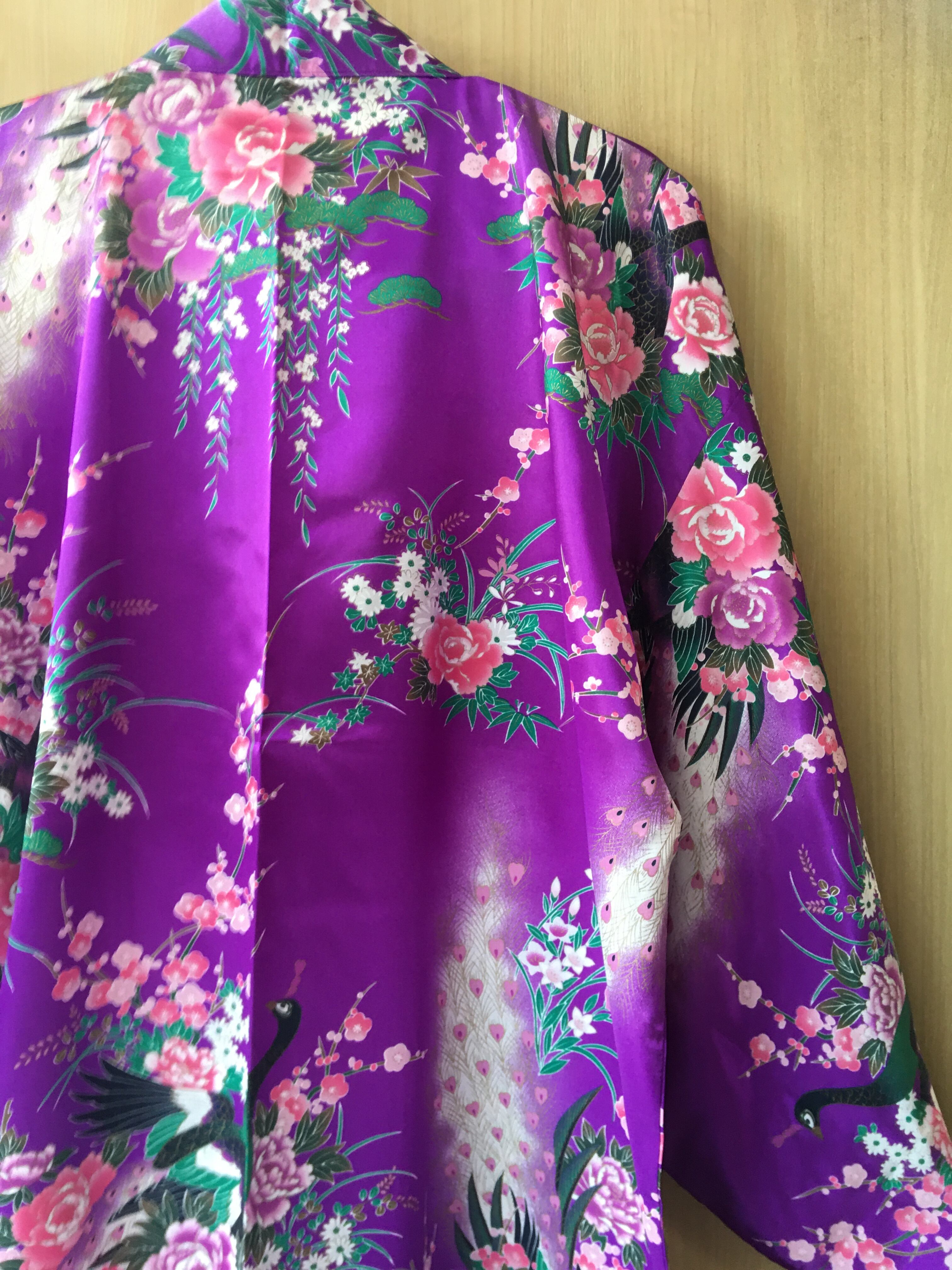 光沢のあるサテン地に色鮮やかな花々と孔雀がコラボしています♪